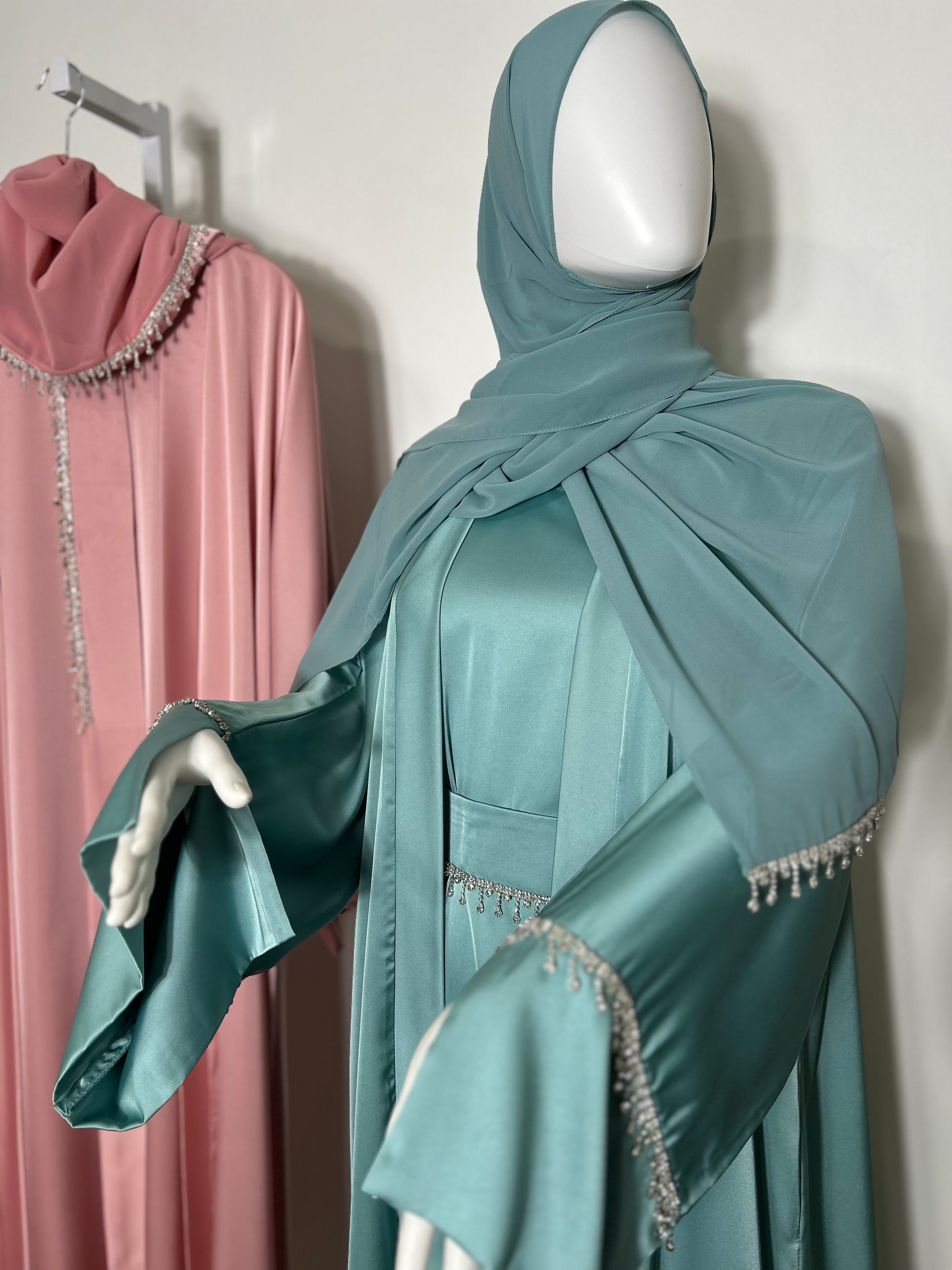 Silky Satin Abaya Set | 4-Piece Dubai Style with Inner Dress, Belt, Scarf & Stone Details | Custom Made Abaya for Weddings and Eid