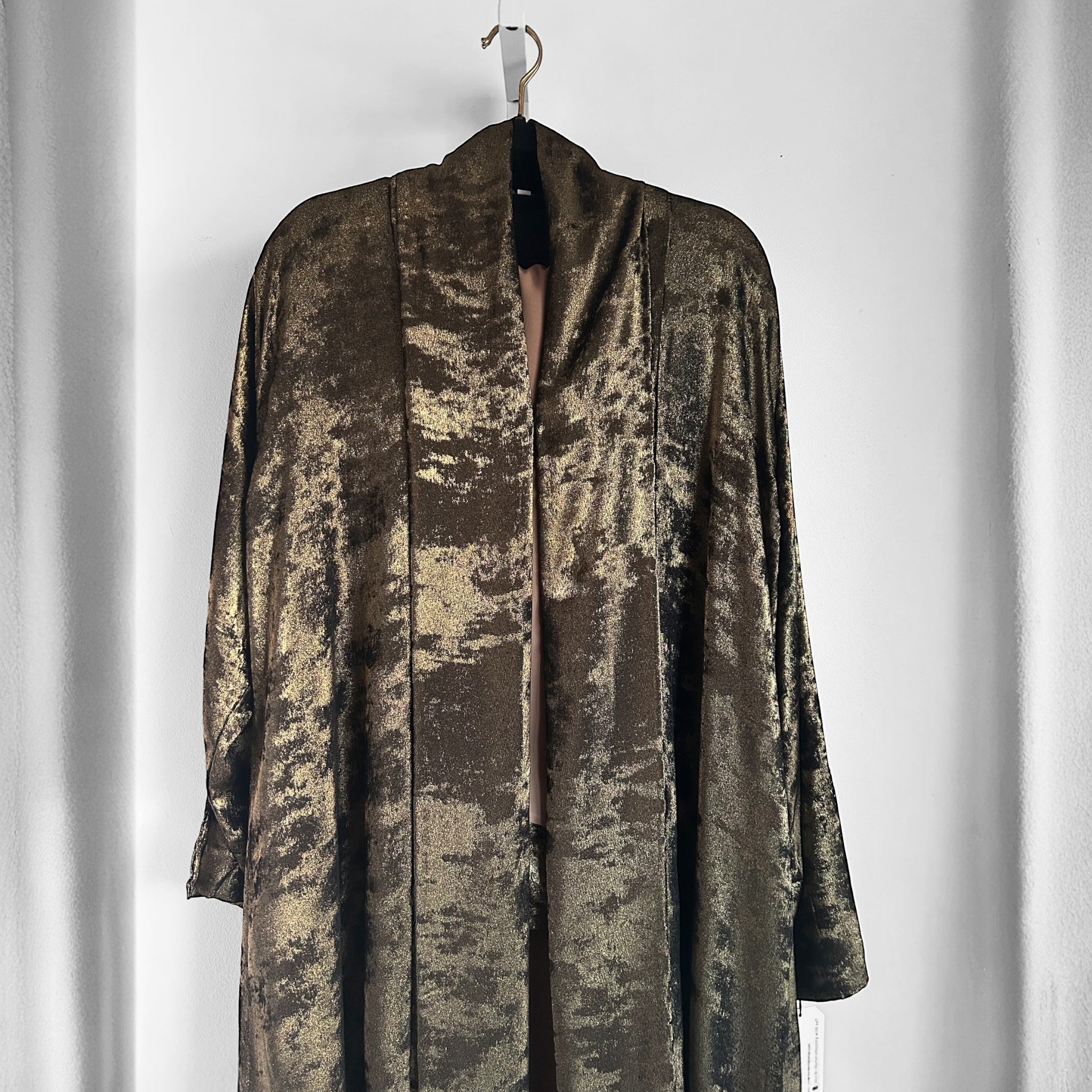 Luxury fabric golden-black abaya set, including an outer layer, inner layer, and matching scarf for a sophisticated look. Perfect fit for special occasions!